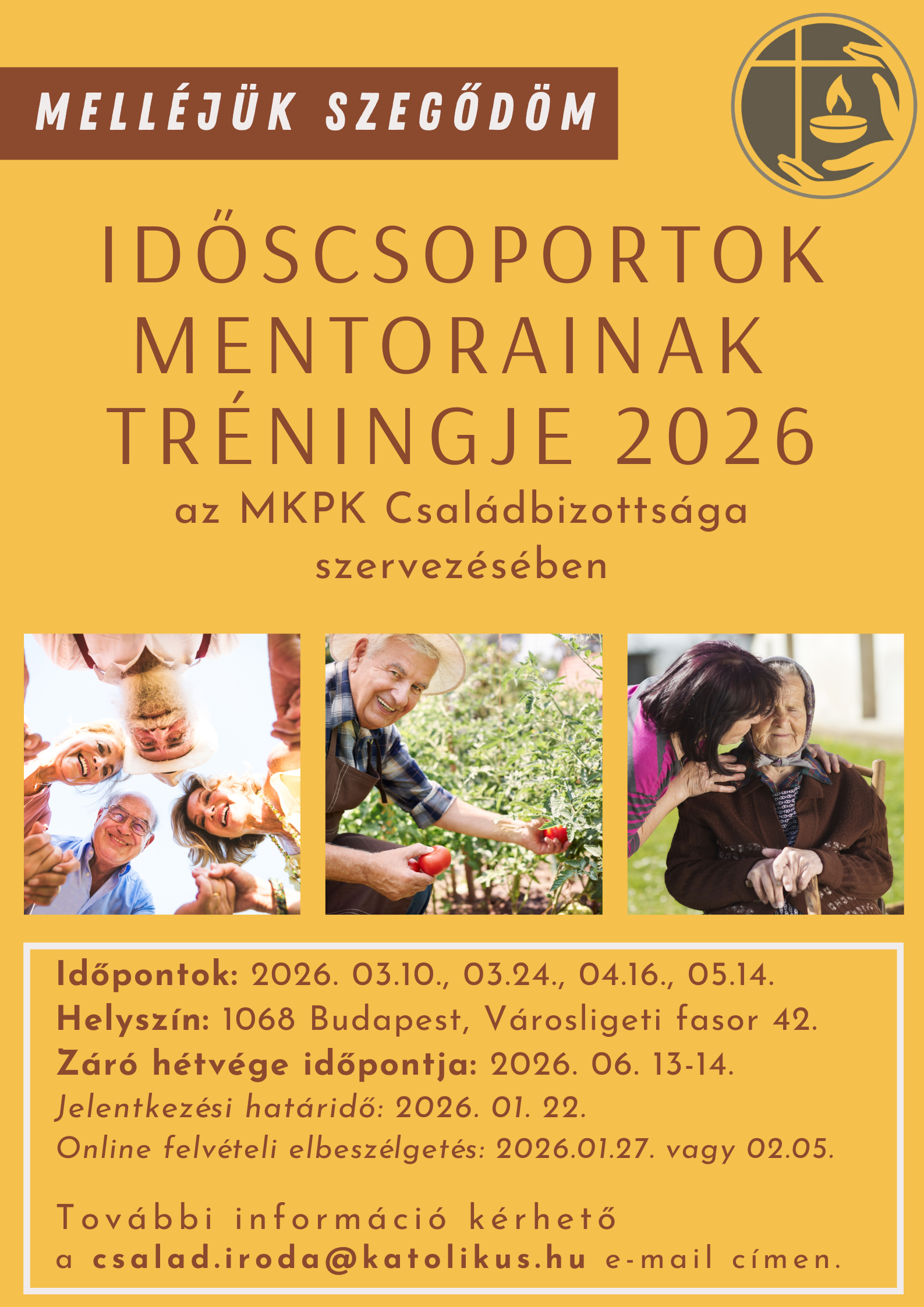 Ebben az évben is elindítja az MKPK Családbizottsága a „Melléjük szegődöm” időspasztorációs csoportok vezetőinek/mentorainak tréningjét. Szeretnénk megszólítani a plébánia híveit, a karitászban tevékenykedőket is, amennyiben valakinek indíttatása van idősek csoportját beindítani, illetve ha már ilyet vezet, továbbképződni.