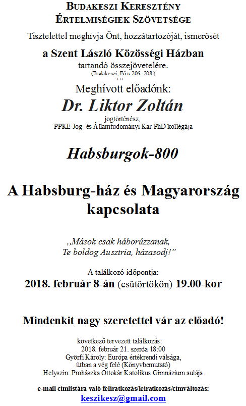 Tisztelettel meghívjuk Önt, hozzátartozóját, ismerősét a február 8-án, csütörtökön 19 órakor a Budakeszi Szent László Házban tartandó összejövetelünkre. Vendégünk Dr. Liktor Zoltán jogtörténész, az előadás témája a Habsburg-ház és Magyarország kapcsolata.