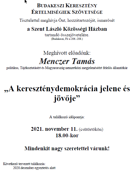 Tisztelettel meghívjuk Önt, hozzátartozóját, ismerősét a november 11-én, csütörtökön 18 órakor a Budakeszi Szent László Házban tartandó összejövetelünkre. Vendégünk Menczer Tamás, politikus, Tájékoztatásért és Magyarország nemzetközi megjelenéséért felelős államtitkár. Az előadás témája „A kereszténydemokrácia jelene és jövője”.
