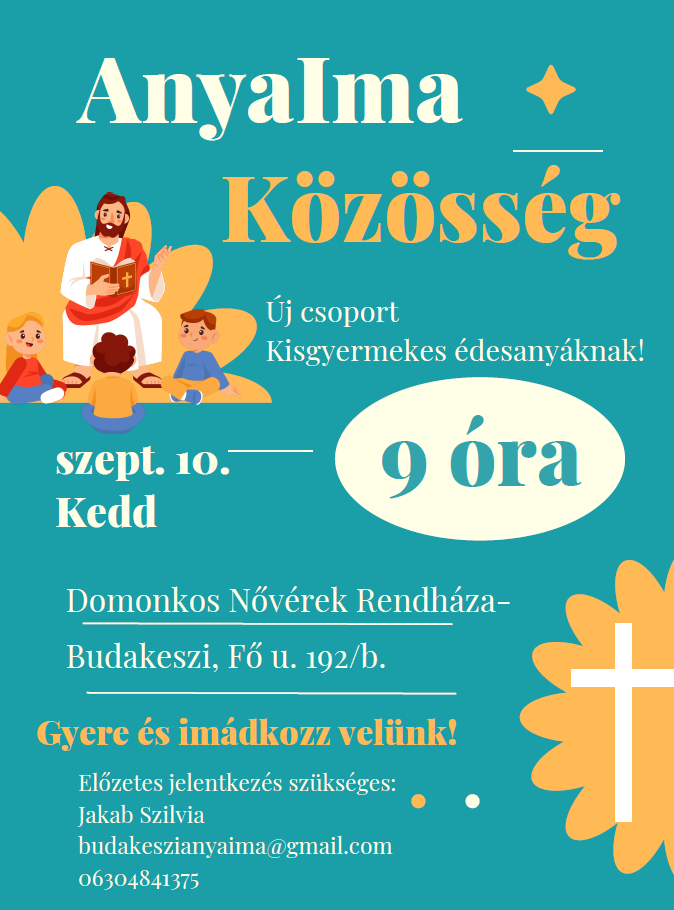 Szeptembertől új AnyaIma csoport indul a Domonkos Nővérek vezetésével fiatal édesanyák számára. Szeretettel várjuk a közös imára és lelki fejlődésre az újonnan csatlakozni kívánó anyukákat gyermekeikkel együtt.