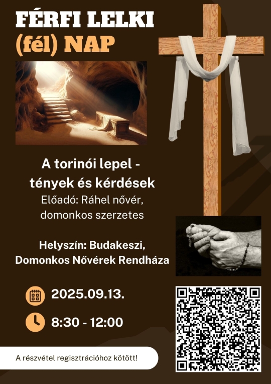 2025. szeptember 13-án, szombat délelőtt férfi lelki napot szervezünk a domonkos nővérek közreműködésével Budakeszin a domonkos nővérek rendházában. Az előadás címe: A torinói lepel - tények és kérdések. Előadó: Ráhel nővér, domonkos szerzetes.