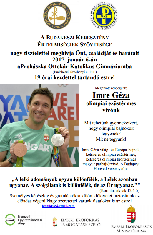 A hagyományoktól eltérve, január 6-án, pénteken találkozunk! A Prohászka Ottokár Katolikus Gimnázium ad otthont a különleges esthez. 19 órai kezdettel Imre Géza ezüstérmes olimpikonunkkal találkozhatunk.