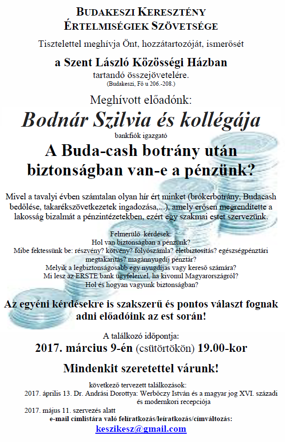 Tisztelettel meghívjuk a 2017. március 9-én, csütörtökön 19 órakor a Budakeszi Szent László Házban tartandó összejövetelünkre. Meghívott vendégünk: Bodnár Szilvia bankfiók igazgató. Az előadás címe: A Buda-cash botrány után biztonságban van-e a pénzünk?.
