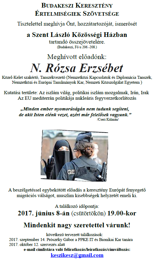 Tisztelettel meghívjuk Önt, hozzátartozóját, ismerősét a június 8-án, csütörtökön 19 órakor a Budakeszi Szent László Házban tartandó összejövetelünkre. Vendégünk N. Rózsa Erzsébet, Közel-Kelet szakértő, a Nemzeti Közszolgálat Egyetem tanszékvezetője.