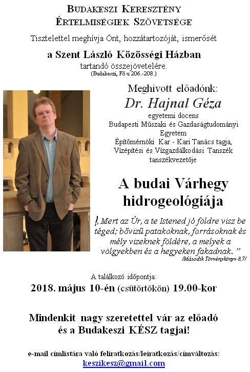 Tisztelettel meghívjuk Önt, hozzátartozóját, ismerősét a május 10-én, csütörtökön 19 órakor a Budakeszi Szent László Házban tartandó összejövetelünkre. Vendégünk Dr. Hajnal Géza egyetemi docens, az előadás témája A budai Várhegy hidrogeológiája.