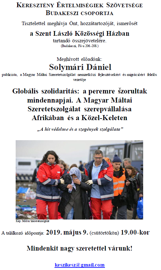 Következő összejövetelünk május 9-én, csütörtökön 19 órakor lesz a Budakeszi Szent László Házban. Vendégünk Solymári Dániel publicista, a Magyar Máltai Szeretetszolgálat nemzetközi fejlesztésekért és migrációért felelős vezetője. Az előadás témája Globális szolidaritás: a peremre szorultak mindennapjai. A Magyar Máltai Szeretetszolgálat szerepvállalása Afrikában és a Közel-Keleten.