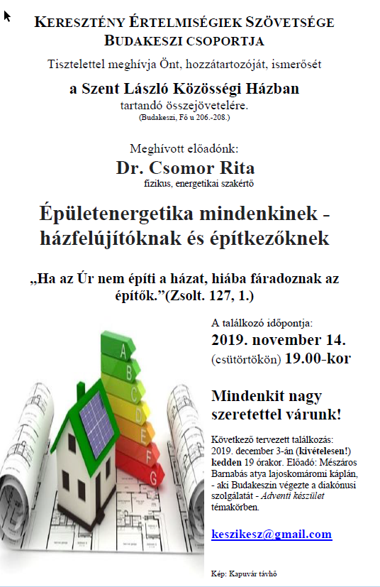 Következő összejövetelünk november 14-én, csütörtökön 19 órakor lesz a Budakeszi Szent László Házban. Vendégünk Dr. Csomor Rita fizikus, energetikai szakértő. Az előadás címe: Épületenergetika mindenkinek - házfelújítóknak és építkezőknek.