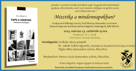 A népszerű lelkiségi szerző, Paul Murray domonkos szerzetes könyvei kapcsán 2023. március 23-án, csütörtökön 19 órakor kerekasztal-beszélgetés lesz a domonkos nővérek rendházában (Budakeszi, Fő u. 192/B) imádságról, lelki életről.