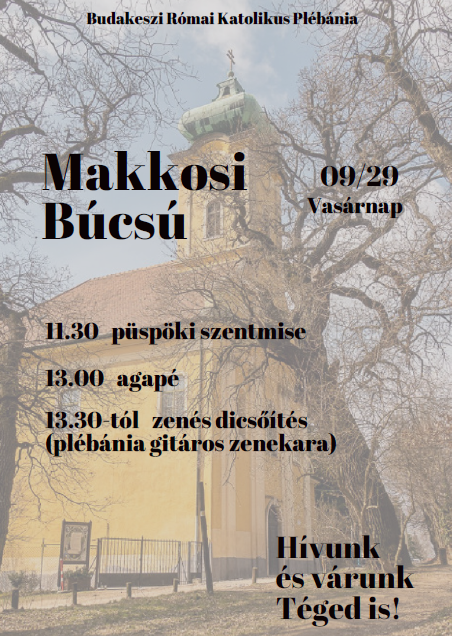 Szeptember 29-én lesz a makkosi búcsú. A mise 11:30-kor kezdődik. A misét követő agapét ugyanúgy, mint tavaly, megtartjuk.